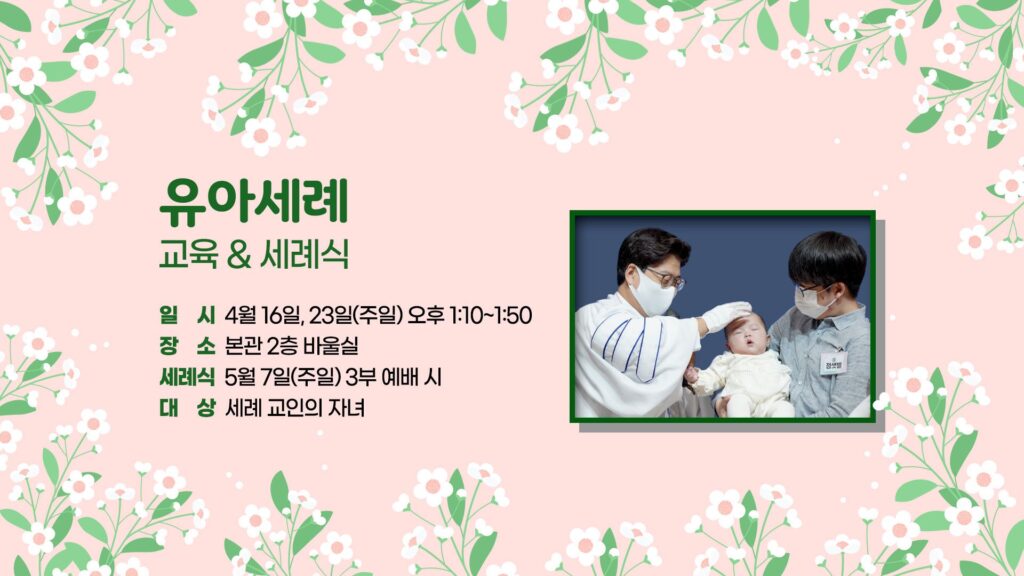 일시 : 4월 16일, 23일(주일) 오후 1:10~1:50 장소 : 본관 2층 바울실 세례식 : 5월 7일(주일) 3부 예배 시 대상…