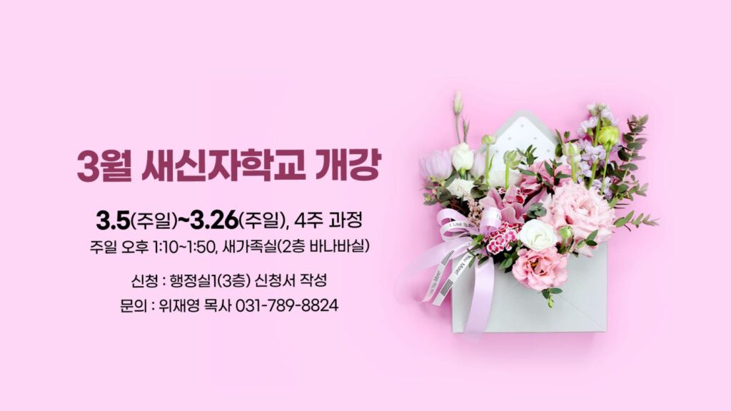 일시 : 3.5(주일) ~ 3.26(주일), 4주 과정 주일 오후 1:10~1:50, 새가족실(2층 바나바실) 신청 : 행정실1(3층) 신청서 작성 문의 : 위재영…