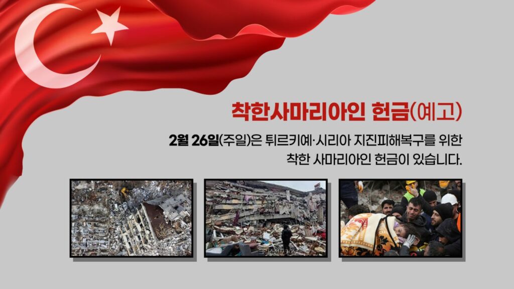 2월 26일(주일)은 튀르키예•시리아 지진피해복구를 위한 착한 사마리아인 헌금이 있습니다.
