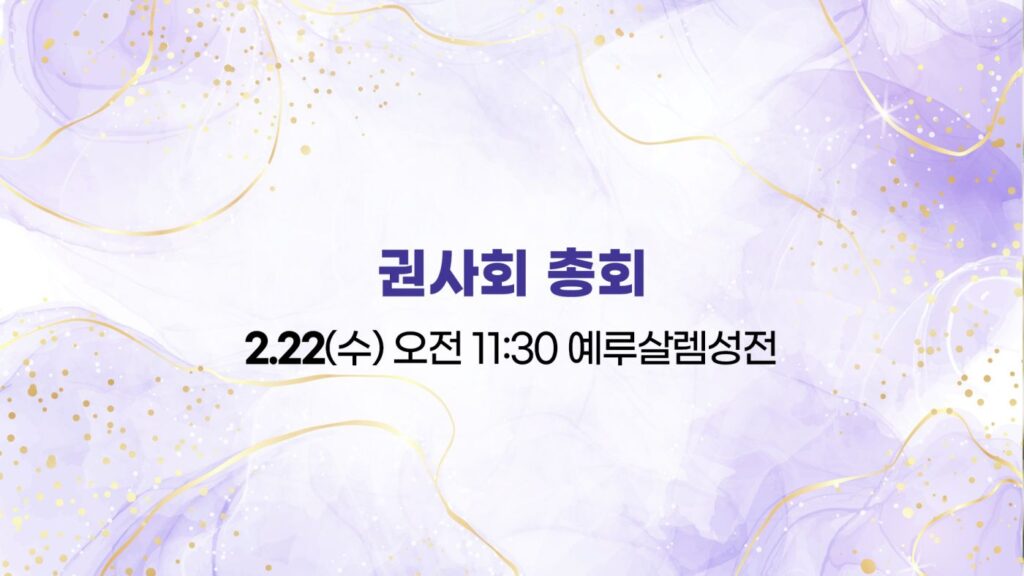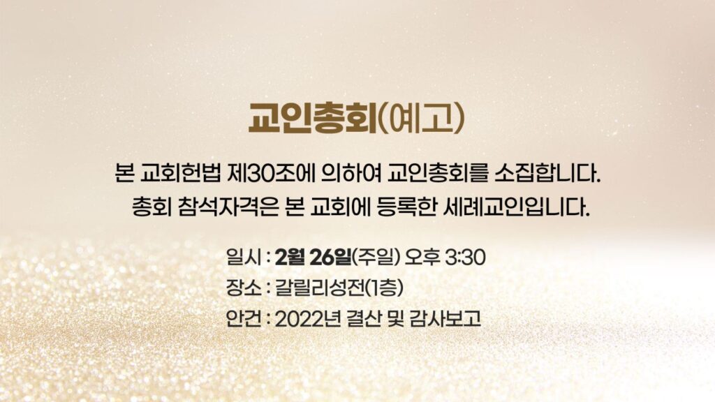 본 교회헌법 제30조에 의하여 교인총회를 소집합니다. 총회 참석자격은 본 교회에 등록한 세례교인입니다. 일시 : 2월 26일(주일) 오후 3:30 장소…