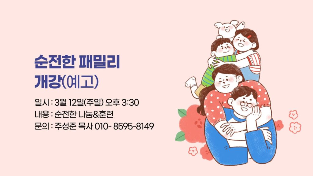 일시 : 3월 12일(주일) 오후 3:30 내용 : 순전한 나눔&훈련 문의 : 주성준 목사 010-8595-8149