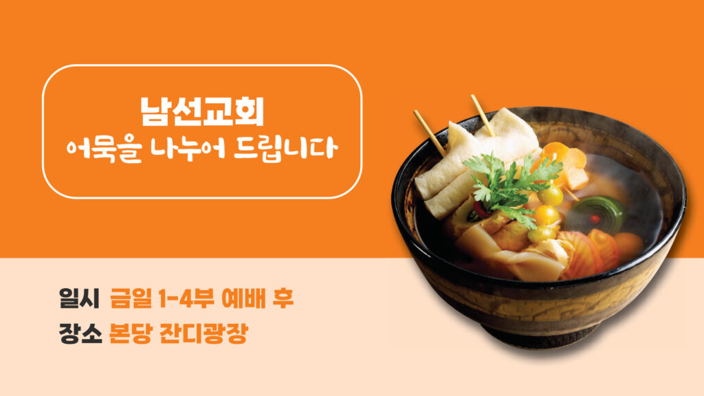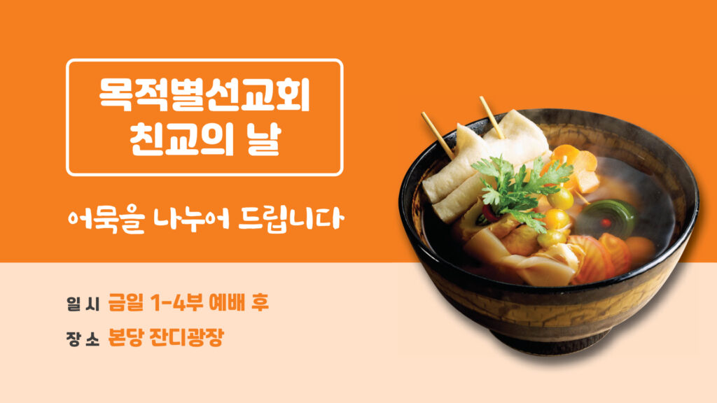 본당 앞 잔디광장에서 어묵을 나누어 드립니다 일시 : 금일 1~4부 예배 후 장소 : 본당 잔디광장