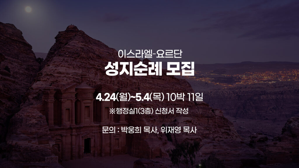 일시 : 4.24(월)~5.4(목) 10박 11일 *행정실1(3층) 신청서 작성 문의 : 박웅희 목사, 위재영 목사