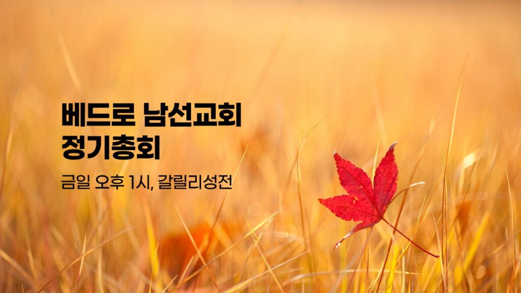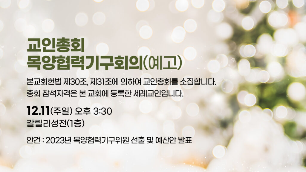 본교회헌법 제30조 제31조에 의하여 교인총회를 소집합니다. 총회 참석자격은 본 교회에 등록한 세례교인입니다. 일시 : 12.11(주일) 오후 3:30 장소 : 갈릴리성전(1층)…