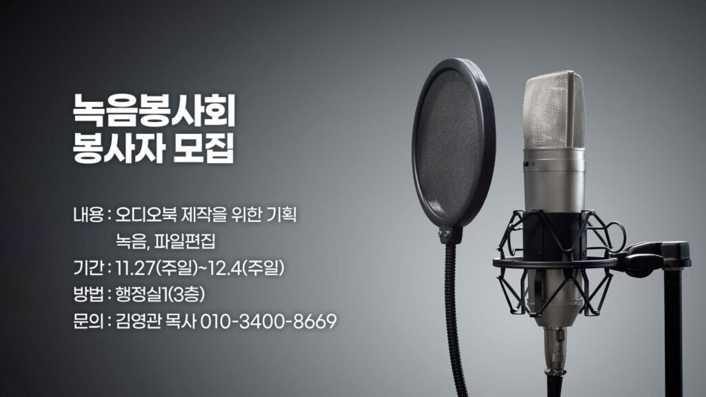 내용 : 오디오북 제작을 위한 기획, 녹음, 파일편집 기간 : 11.27(주일)~12.4(주일) 신청방법 : 행정실1 (3층) 문의 : 김영관 목사 010-3400-8669