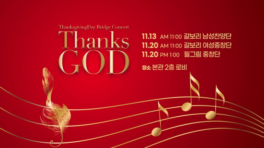 Thanks GOD - ThanksgivingDay Bridge Concert 11.13 오전 11시 갈보리 남성찬양단 11.20 오전 11시 갈보리 여성중창단 11.20 오후 1시 필그림…