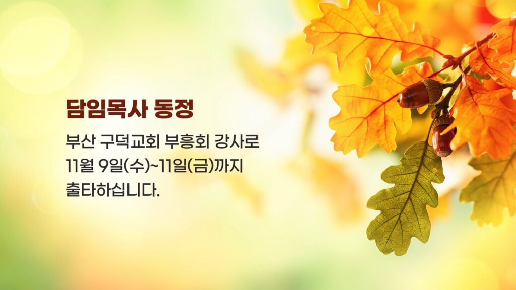부산 구덕교회 부흥회 강사로 11.9(수)~11(금)까지 출타하십니다