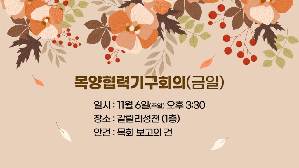 일시 : 11.6(주일) 오후 3:30 장소 : 갈릴리성전(1층) 안건 : 목회 보고의 건