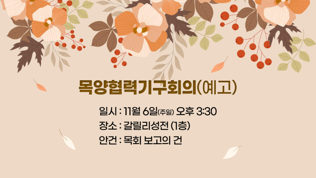 일시 : 11월 6일(주일) 오후 3:30 장소 : 갈릴리성전 (1층) 안건 : 목회 보고의 건