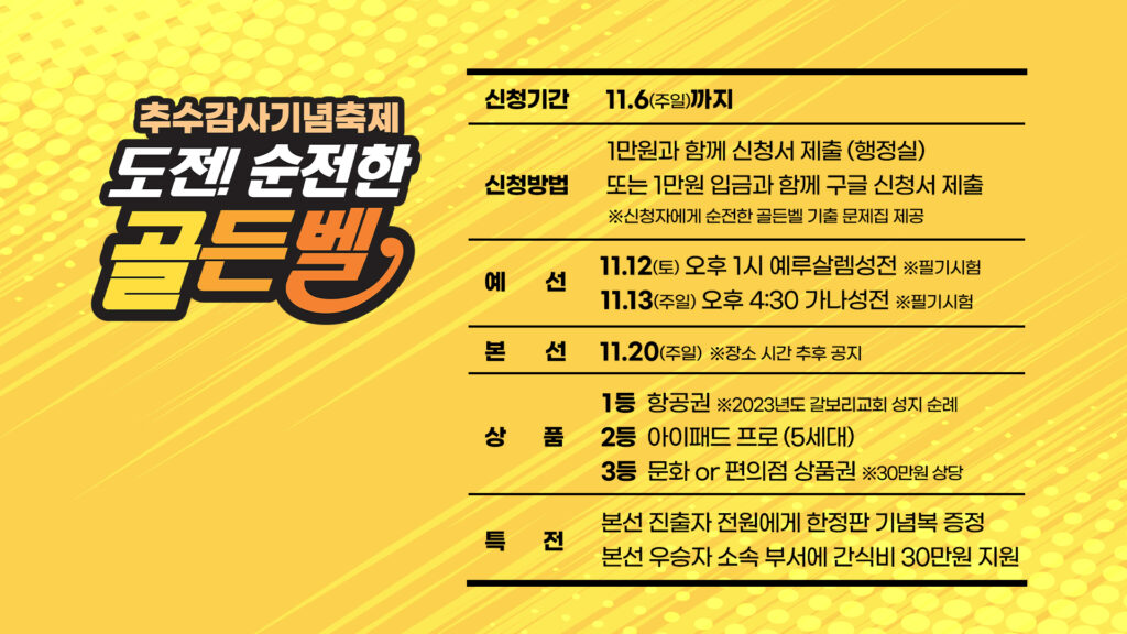 신청기간 : 10.16(주일) ~ 11. 6(주일) 참여방법 : 1만원과 함께 신청서 제출(행정실 또는 1만원 입금과 함께 구글 신청서 제출…