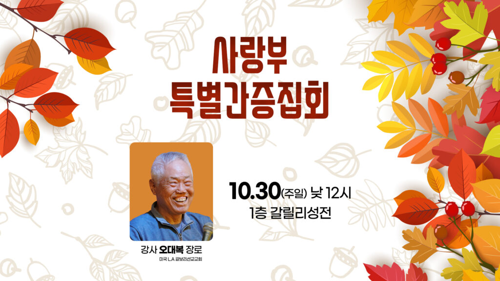 일시 : 10월 30일(주일) 낮 12시 장소 : 1층 갈릴리성전 강사 : 오대복 장로 (미국 LA갈보리선교교회)