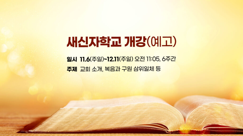 일시 : 2022년 11월 6일(주일) ~ 12.11(주일) 오전 11:05, 6주간 주제 : 교회 소개, 복음과 구원 삼위일체 등
