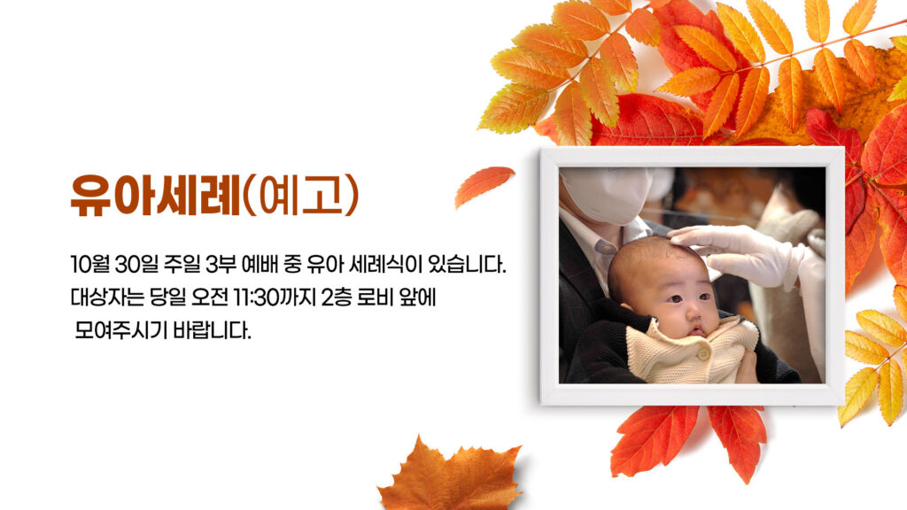 10월 30일 주일 3부 예배 중 유아 세례식이 있습니다. 대상자는 당일 오전 11:30까지 2층 로비 앞에서 모여주시기 바랍니다.