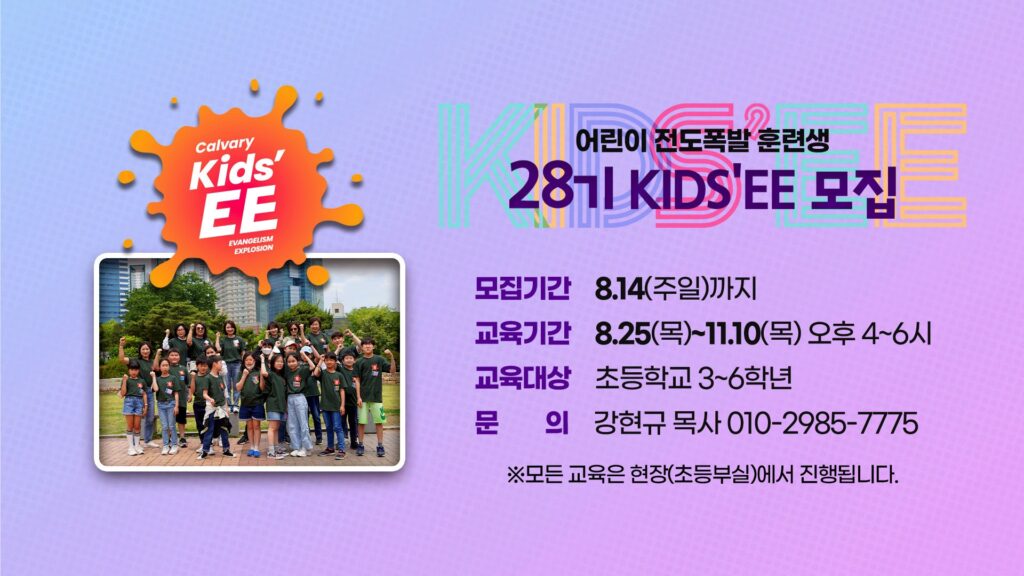 모집기간 : 8.14(주일)까지 교육기간 : 8.25(목)~11.10(목) 오후 4~6시 교육대상 : 초등학교 3-6학년 문의 : 강현규 목사 010-2985-7775 *모든 교육은 현장(초등부실)에서…