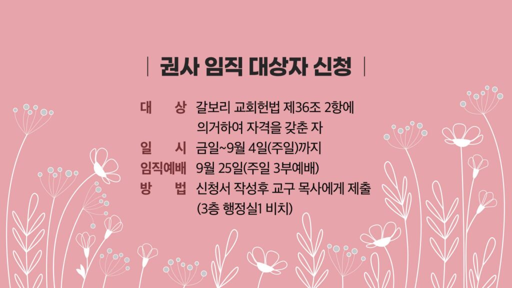 대상 : 갈보리 교회헌법 제36조 2항에 의거하여 자격을 갖춘 자 일시 : 9월 4일(주일) 까지 임직예배 : 9월 25일(주일 3부…