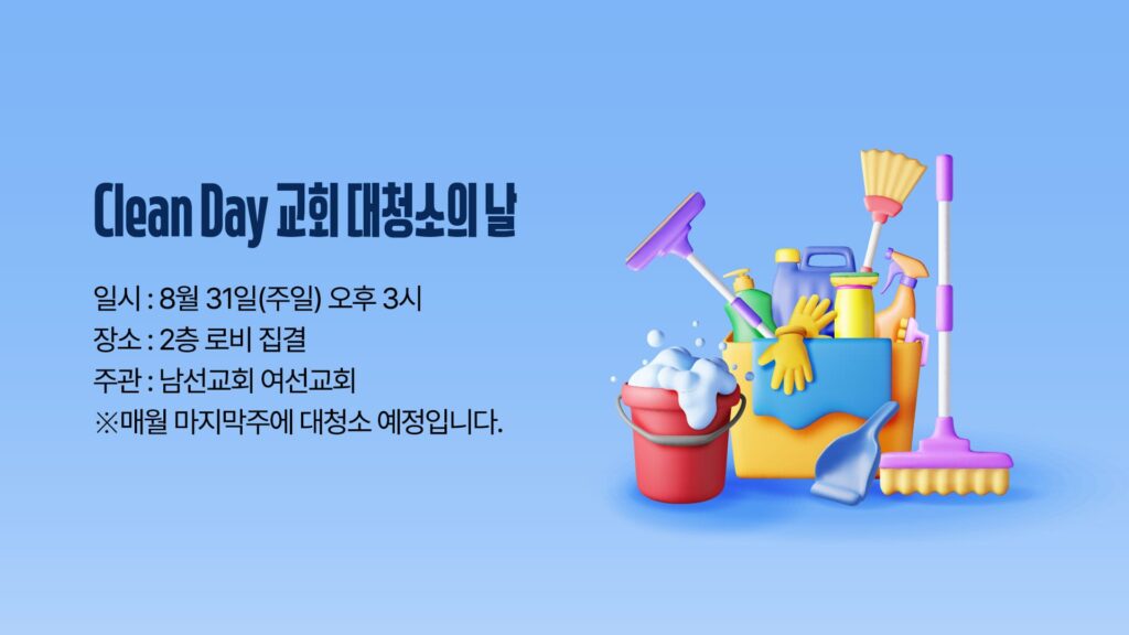 일시 : 8월 31일(주일) 오후 3시장소 : 2층 로비 집결주관 : 남선교회 여선교회※매월 마지막주에 대청소 예정입니다.