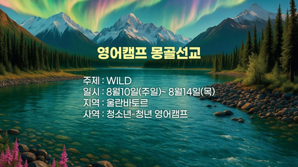 주제 : WILD일시 : 8월10일(주일)~ 8월14일(목)지역 : 울란바토르사역 : 청소년-청년 영어캠프