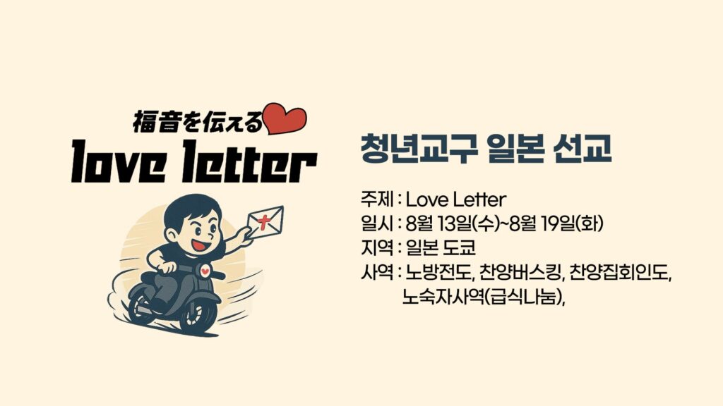 주제 : Love Letter일시 : 8월 13일(수)~8월 19일(화)지역 : 일본 도쿄사역 : 노방전도, 찬양버스킹, 찬양집회인도, 노숙자사역(급식나눔)