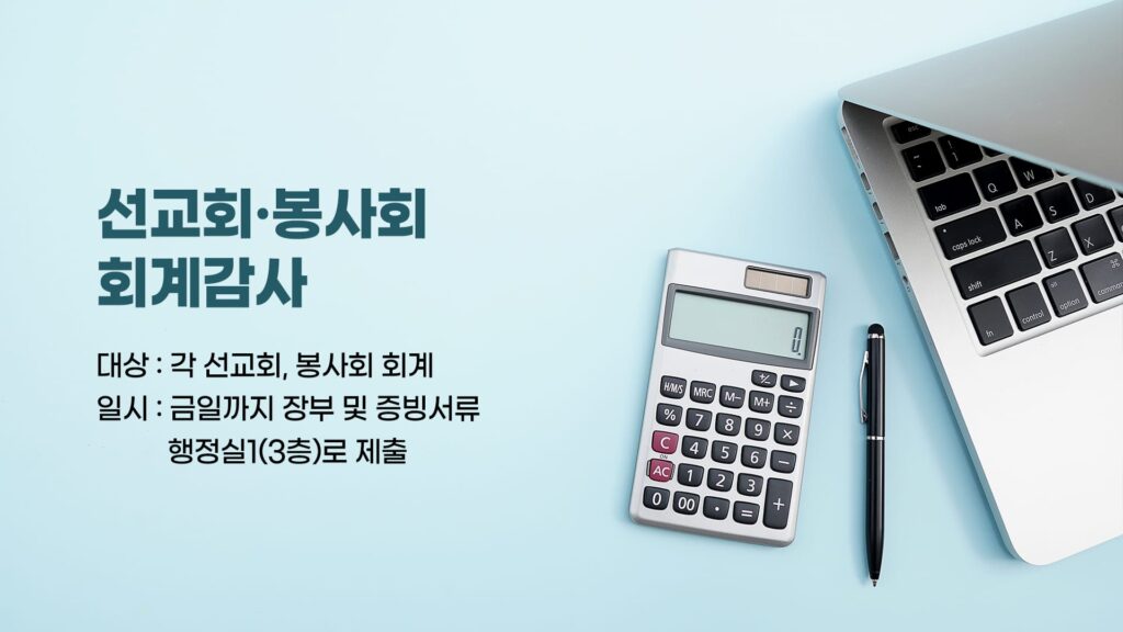 대상 : 각 선교회, 봉사회 회계 일시: 금일까지 장부 및 증빙서류 행정실1(3층)로 제출