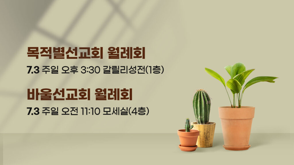 목적별선교회 : 7.3 주일 오후 3:30 갈릴리성전 (1층) 바울선교회 : 7.3 주일 오전 11:10 모세실 (4층)