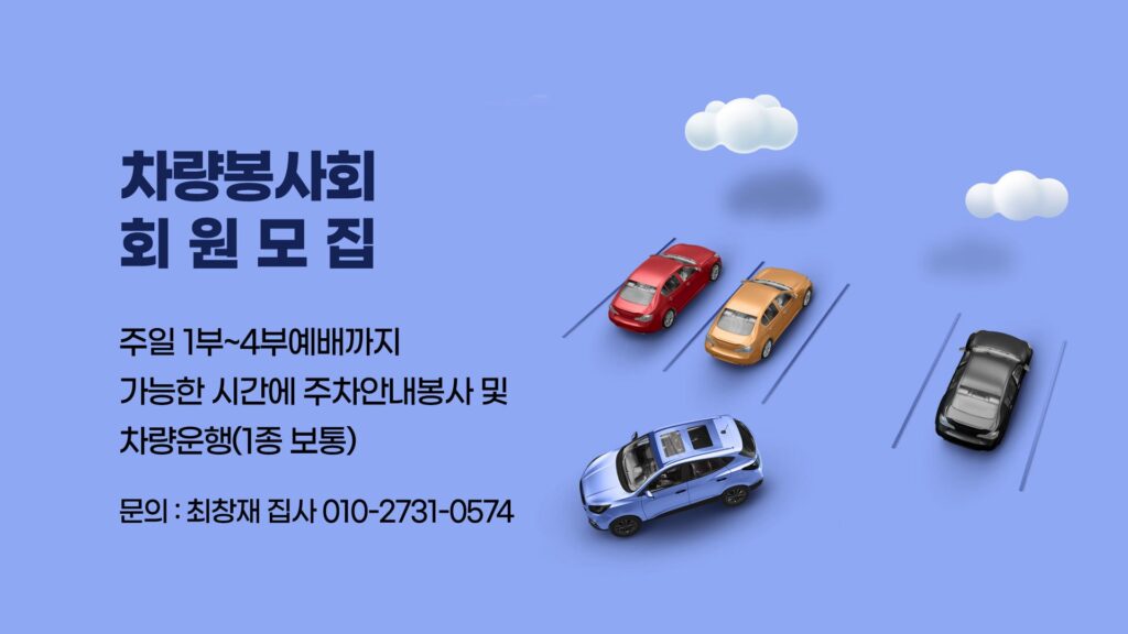 주일 1부~4부예배까지 가능한 시간에 주차안내 봉사 및 차량운행 (1종 보통) 문의 : 최창재 집사 010-2731-0574