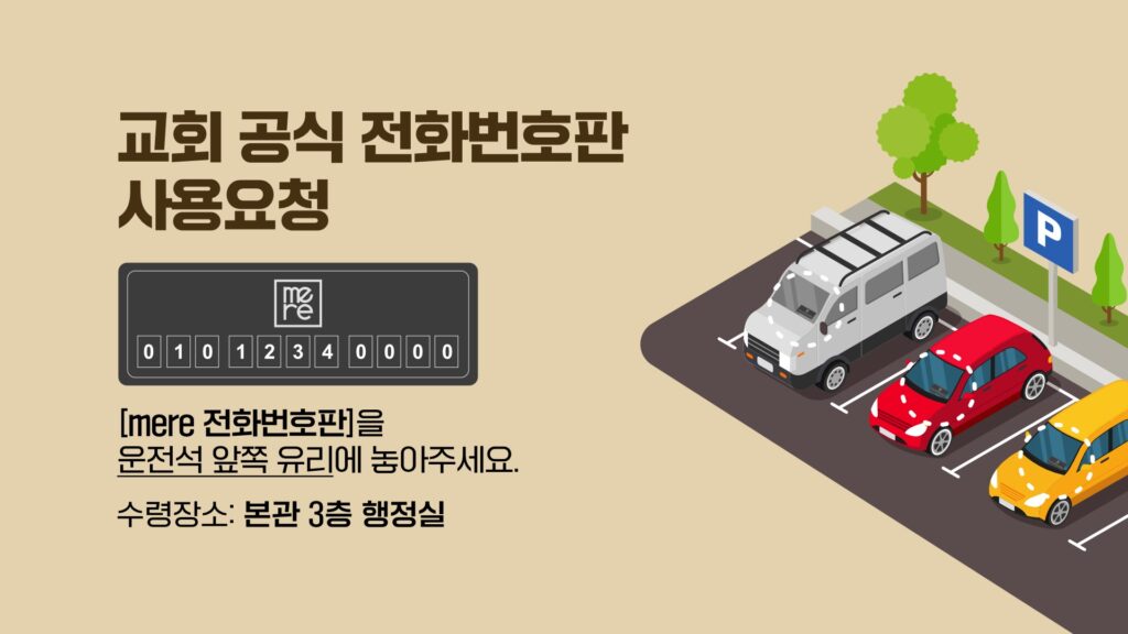 [MERE 전화번호판]을 운전석 앞쪽 유리에 놓아주세요. 수령장소 : 본관 3층 행정실
