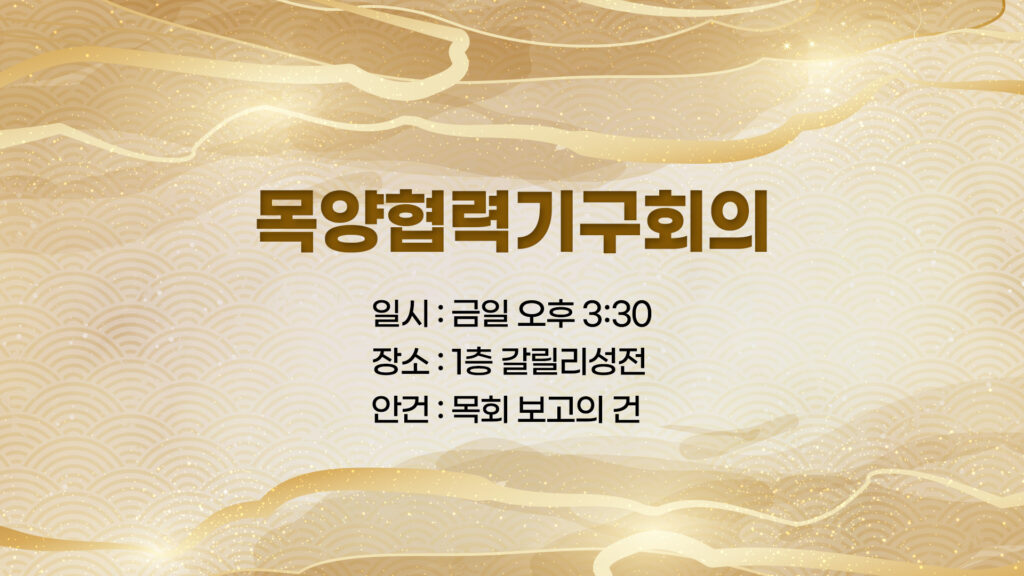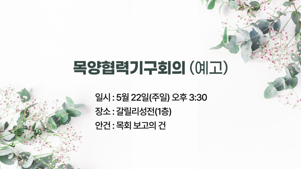 일시 : 5월 22일(주일) 오후 3:30 장소 : 갈릴리성전(1층) 안건 : 목회보고의 건