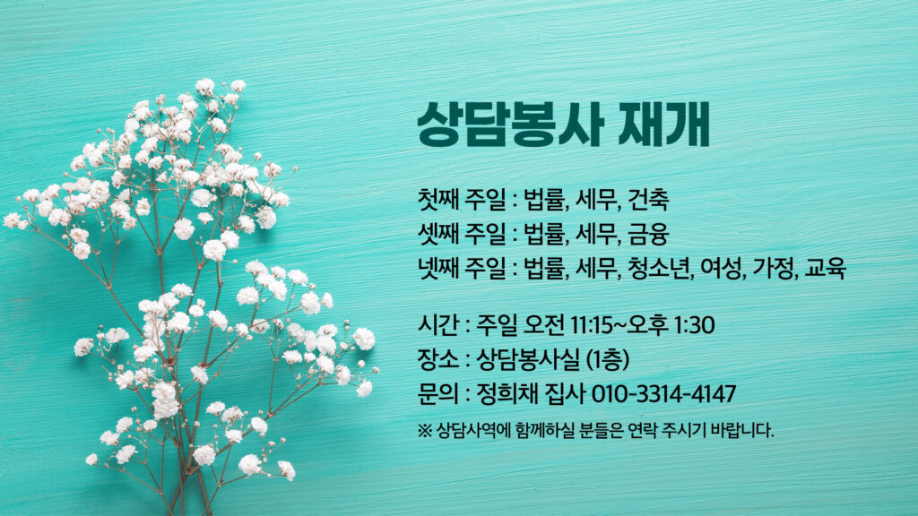 첫째 주일 : 법률, 세무, 건축 셋째 주일 : 법률, 세무, 금융 넷째 주일 : 법률, 세무, 청소년, 여성, 가정,…