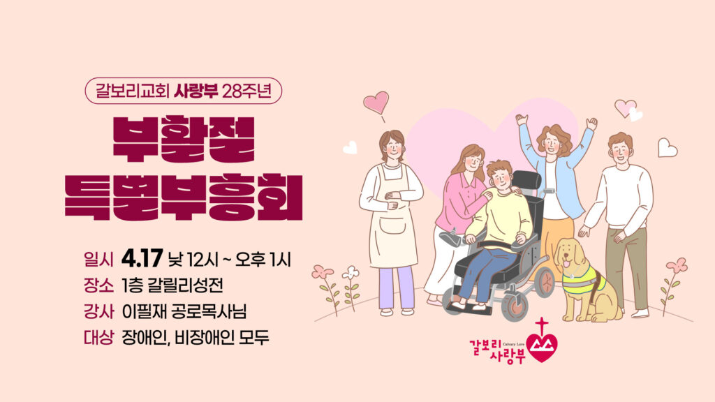 일시 : 4.17 낮 12시 ~ 오후 1시 장소 : 1층 갈릴리성전 강사 : 이필재 공로목사님 대상 : 장애인, 비장애인…