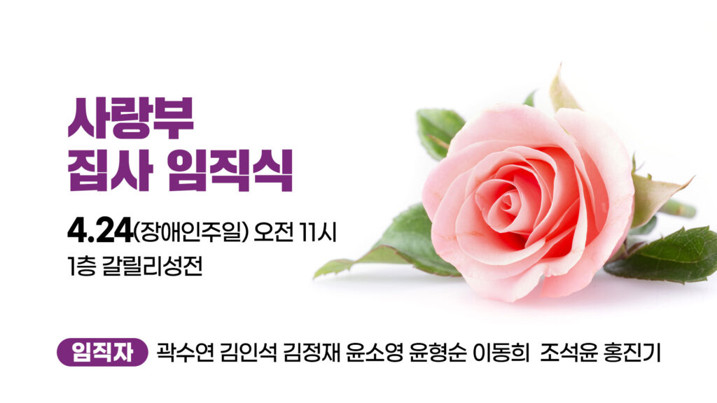 일시 : 4.24(장애인주일) 오전 11시 장소 : 1층 갈릴리성전 임직자 : 곽수연, 김인석, 김정재, 윤소영, 윤형순, 이동희, 조석윤, 홍진기