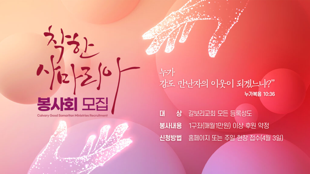 대상 : 갈보리교회 모든 등록성도 봉사내용 : 1구좌(매월 1만원) 이상 후원 약정 신청방법 : 홈페이지 또는 주일 현장 접수 (4월…