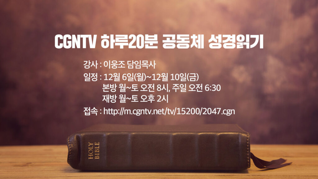 강사: 이웅조 목사 일정: 12월6일(월)~12월10(금) 본방: 월~토 오전 8시, 주일 오전 6:30 재방: 월~토 오후 2시 접속: http://m.cgntv.net/tv/15200/2047.cgn
