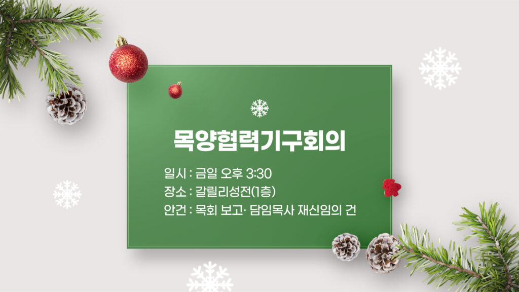 일시: 금일 오후 3:30 장소: 갈릴리성전 (1층) 안건: 목회 보고, 담임목사님 재신임의 건