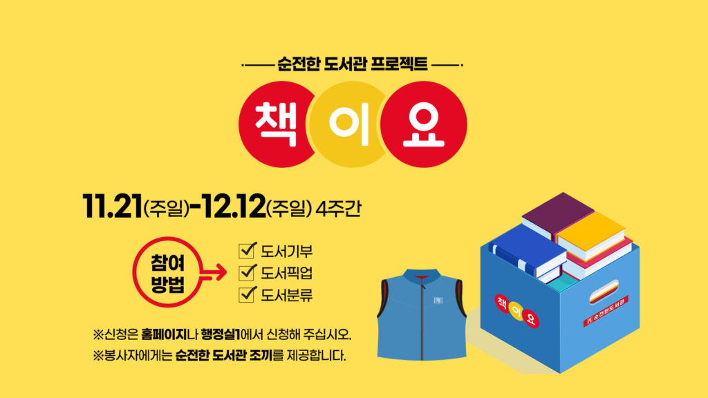 순전한 도서관 프로젝트 책이요 일시: 11월21일(주일) ~ 12월12일(주일) 4주간 참여방법: 1. 도서기부 2. 도서픽업 3. 도서분류 신청방법: 홈페이지, 행정실1(3층)