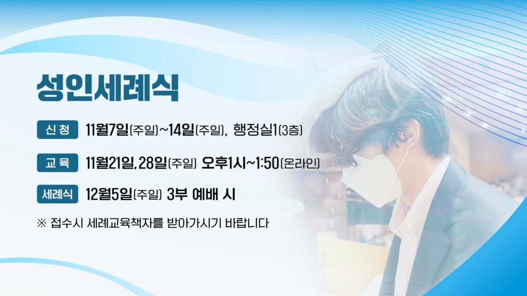 신청: 11월7일(주일) ~ 11월 14일(주일), 행정실1 (3층) 교육: 11월21일,28일(주일) 오후 1:10~1:50분 (온라인) 세례식: 12월5일(주일) 3부 예배