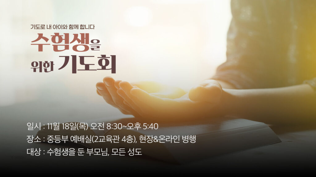 일시: 11월 18일 (목) 오전 8:40~오후 5:40 장소: 제2교육관 4층 (중등부 예배실) 대상: 수험생 자녀를 둔 부모님, 모든 성도