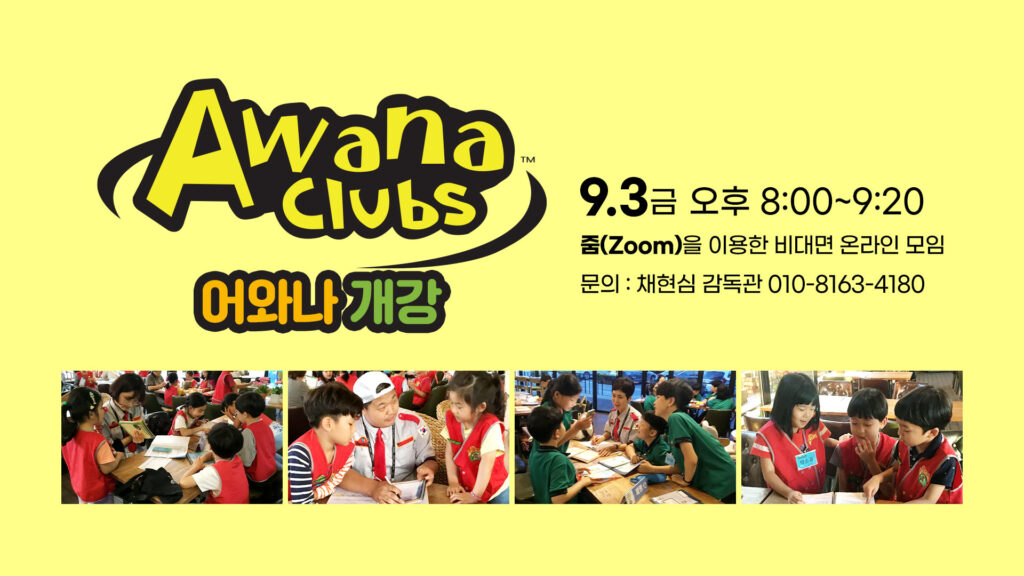 어와나 개강 일시: 9.3(금) 오후 8:00~9:20 줌(zoom)을 통한 비대면 온라인 모임 문의: 채현심 감독관 010-8163-4180