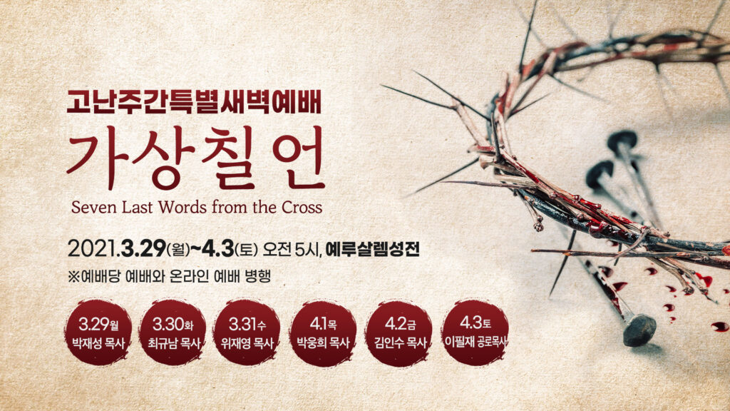 고난주간특별새벽예배 가상칠언 일시: 3.29(월)~4.3(토) 오전 5시, 예루살렘 성전