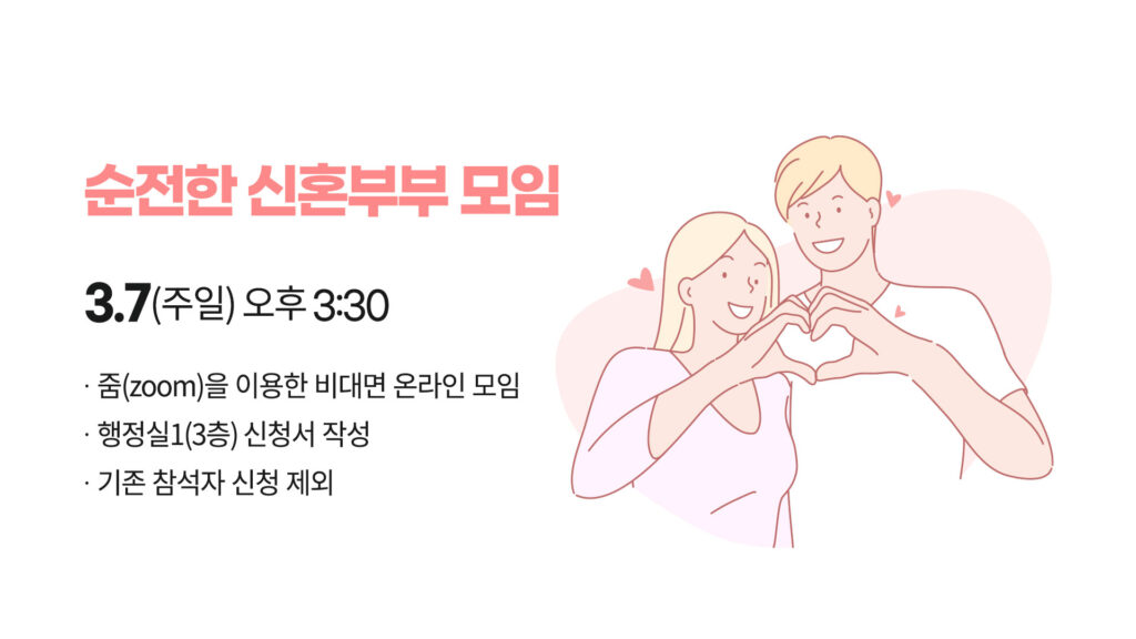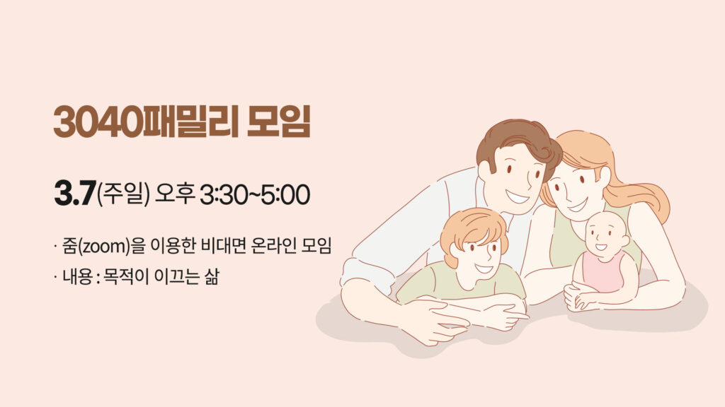 3.7(주일) 오후 3:30 줌(zoom)을 이용한 비대면 온라인 모임 행정실1 (3층) 신청서 작성 기존 참석자 신청 제외