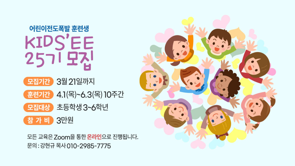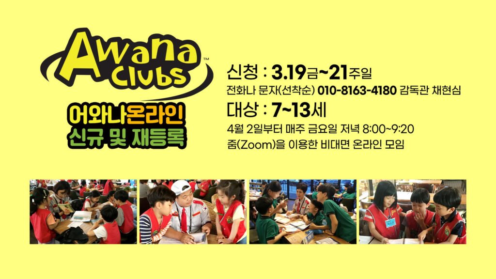 신청: 3.19(금)~21(일) 전화나 문자 010-8163-4180 감독관 채현심 대상: 7~13세 4월 2일부터 매주 금요일 저녁 8:00~9:20 줌(zoom)을 이용한 비대면 온라인 모임
