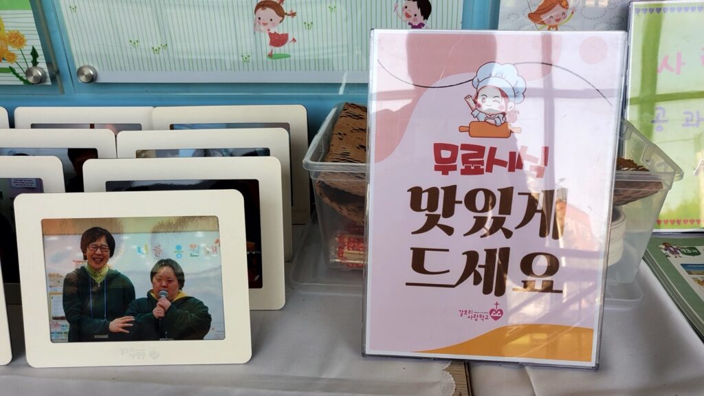 1층 갈릴리홀에서는 그동안 사랑부 학생들이 만든 작품들을 감상하실 수 있으며, 사랑학교에서 직접 만든 빵과 쿠키를 무료로 시식하실 수 있습니다.