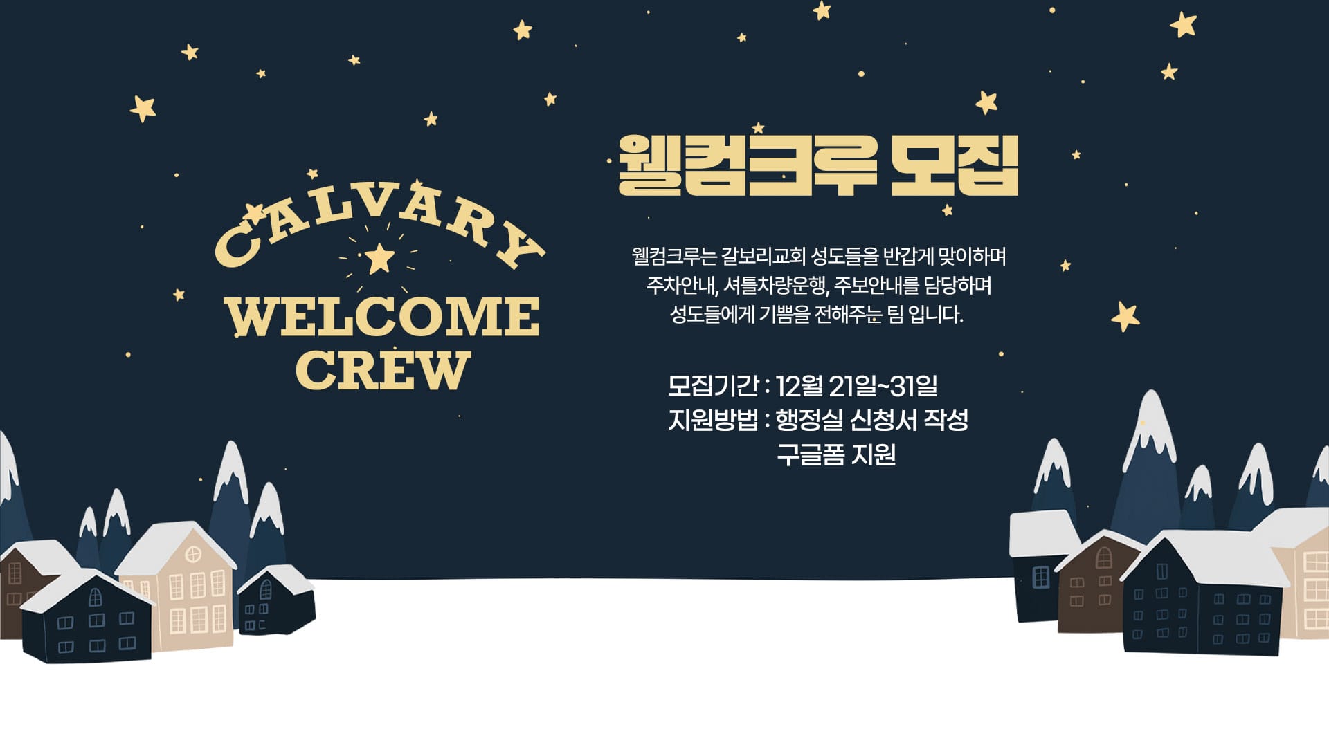 웰컴크루는 갈보리교회 성도들을 반갑게 맞이하며 주차안내, 셔틀차량운행, 주보안내를 담당하며 성도들에게 기쁨을 전해주는 팀 입니다.