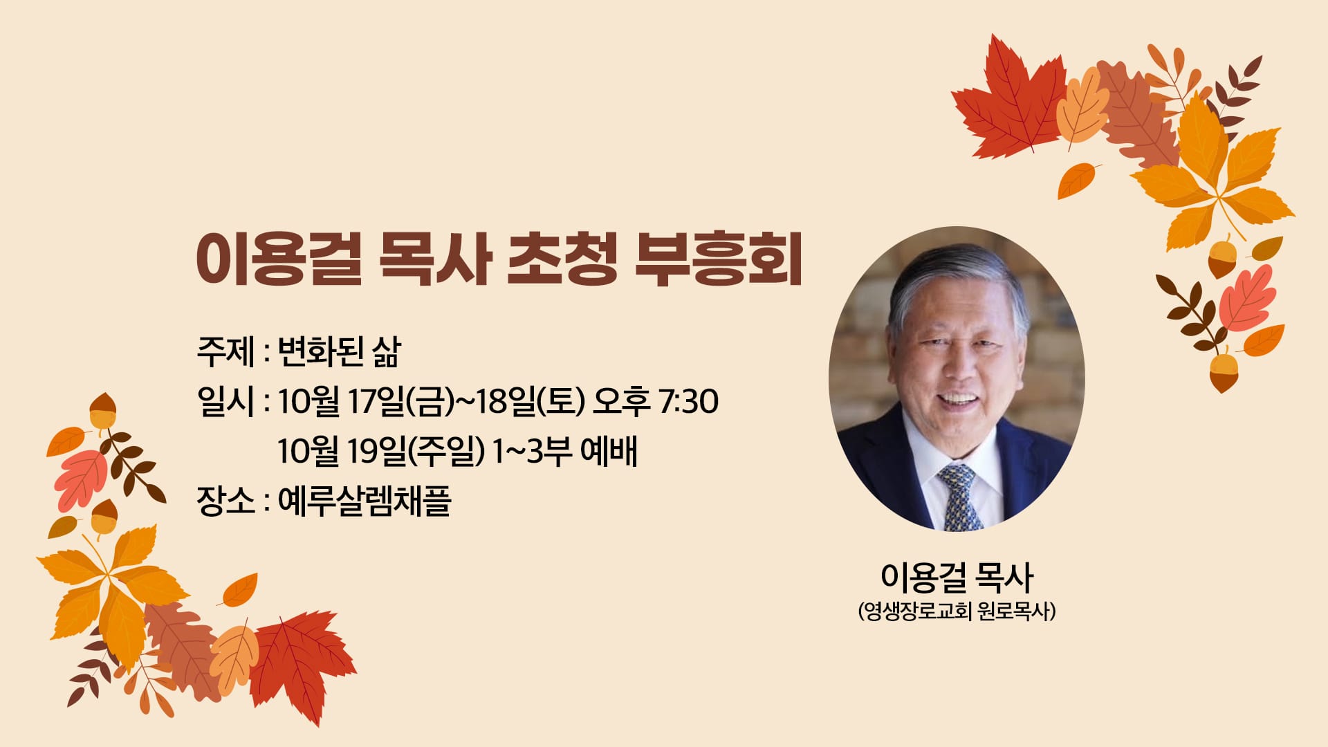 일시 : 10월 17일(금)~18일(토) 오후 7:30, 10월 19일(주일)1~3부 예배