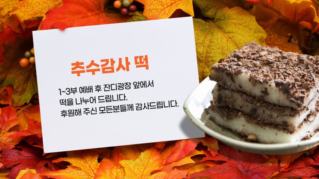 1~3부 예배 후 잔디광장 앞에서 떡을 나누어 드립니다.